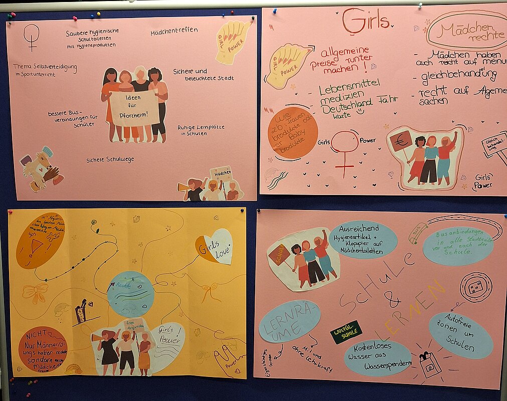 An verschiedenen Thementischen wie Schule, Freizeit oder Mitbestimmung diskutierten die Mädchen ihre Ideen und Wünsche. Ihre wichtigsten Forderungen hielten sie auf selbstgestalteten Protestschildern fest. Diese überreichten sie am 16. Oktober an Oberbürgermeister Peter Boch im Neuen Rathaus.