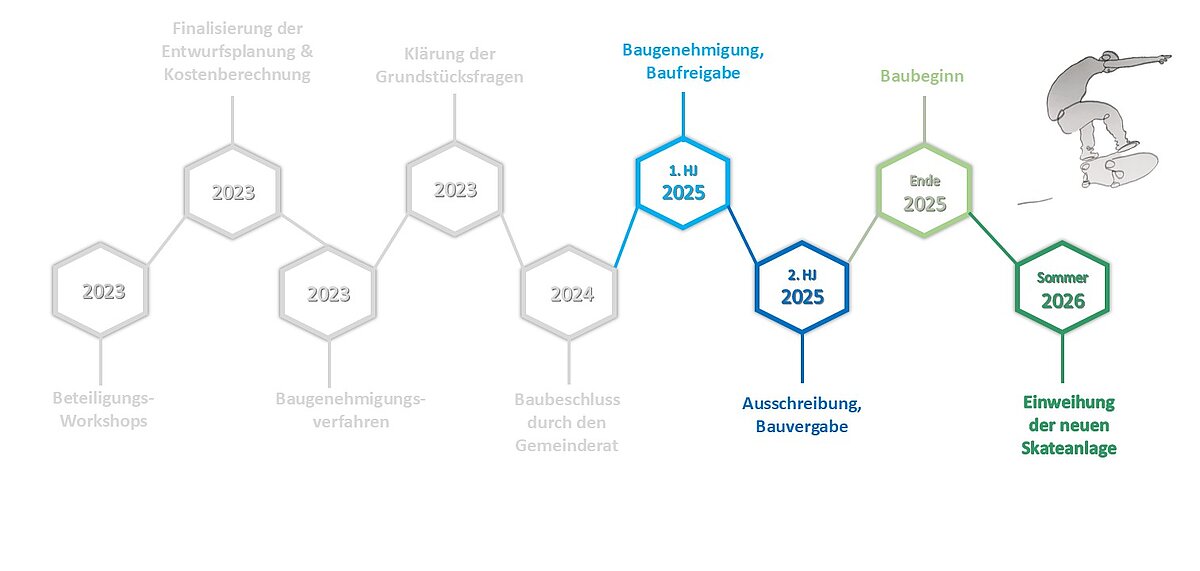 Der Gemeinderat beschloss in seiner Sitzung am 07.05.2024 den Bau der Skateanlage. Hier geht's zur Vorlage "Neubau Skateanlage und ergänzender Freizeitsporteinrichtungen - Enzauenpark - Baubeschluss". Im selben Jahr erfolgte die Genehmigungsplanung und der Bauantrag wurde eingereicht.