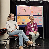 Auf dem Bild ist der Pforzheimer Bürgermeister Frank Fillbrunn zu sehen, wie er mit Schülern im Gespräch ist.