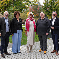 Auf dem Bild sind fünf Männer auf dem Dach des Reuchlin-Gymnasiums zu sehen, die sich über die Inbetriebnahme der dortigen Photovoltaikanlage freuen.