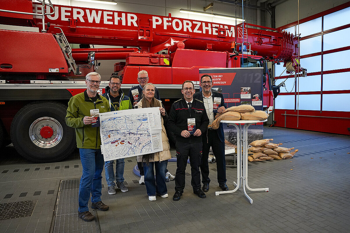In den vergangenen Jahren wurde auch die Stadt Pforzheim von Extremwetterereignissen wie Starkregen und Hochwasser nicht verschont. Und auch für die Zukunft rechnen Fachleute infolge des Klimawandels mit häufigeren und intensiveren Wetterereignissen in der Region. Um die Bürgerinnen und Bürger frühzeitig für diese Herausforderungen zu sensibilisieren, hat die Feuerwehr gemeinsam mit dem Amt für Umweltschutz (AfU), dem Grünflächen- und Tiefbauamt (GTA) sowie dem Eigenbetrieb Stadtentwässerung (ESP) einen neuen Flyer mit wichtigen Verhaltenstipps im Faller solcher Ereignisse entwickelt. Vorgestellt wurde der Flyer am heutigen Montag, 10. November, in der Hauptfeuerwache von Bürgermeister Tobias Volle sowie Feuerwehrkommandant Sebastian Fischer, der Leiterin des GTA, Sandra Heitkamp sowie dem Leiter des AfU, Armin Aydt. Der Informationsflyer wird mit dem Abfallkalender 2026 an alle Haushalte in Pforzheim verteilt.
