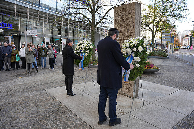 Musikalisch wurde die Gedenkfeier von Fenella Bockmaier am Klavier umrahmt. Nach dem Gebet des Rabbiners Moshe Yudelevitz erfolgte die gemeinsame Kranzniederlegung von Stadt und Jüdischer Gemeinde direkt am Mahnmal auf dem „Platz der Synagoge“ an der Zerrennerstraße/Goethestraße.