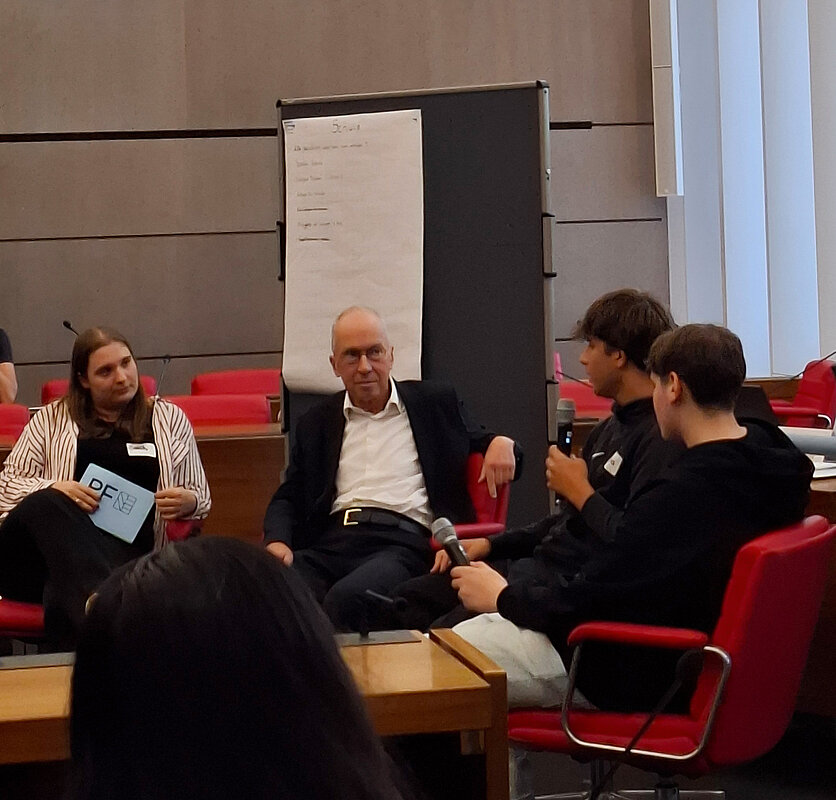 Auf dem Bild ist der Pforzheimer Bürgermeister Frank Fillbrunn zu sehen, wie er mit Schülern im Gespräch ist.