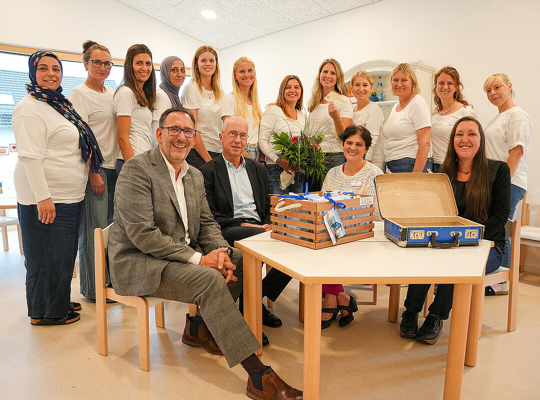 In feierlichem Rahmen hat Sozialbürgermeister Frank Fillbrunn am heutigen Montag die neue städtische Kindertagesstätte in der Johann-Heinz-Straße offiziell eingeweiht. Die Einrichtung im Stadtteil Büchenbronn wird vom Amt für städtische Kindertagesstätten betrieben und schafft weitere dringend benötigte Betreuungsplätze für Pforzheims jüngste Bürgerinnen und Bürger. Errichtet wurde das zukunftsweisende Projekt von der städtischen Tochtergesellschaft Stadtbau, die die neugeschaffene Einrichtung nun offiziell an die Stadt übergeben hat. Die viergruppige Kita bietet Platz für mindestens 60 Kinder – darunter zwei Gruppen für unter Dreijährige – und wurde in ökologischer Holzsystembauweise errichtet. „Mit der neuen Kita setzen wir unseren konsequenten Ausbau der Kinderbetreuung fort und schaffen moderne, nachhaltige Räume, in denen unsere Kleinsten optimale Entwicklungs- und Lernmöglichkeiten finden“, betonte Bürgermeister Fillbrunn bei der Eröffnung, an der auch Baubürgermeister Tobias Volle sowie Claudia Lorena Rautenberg, Leiterin des Amtes für städtische Kindertageseinrichtungen sowie die Stadtbau-Prokuristin Karin Günther und Kita-Leiterin Katja Diesner mit ihrem Team teilnahmen.