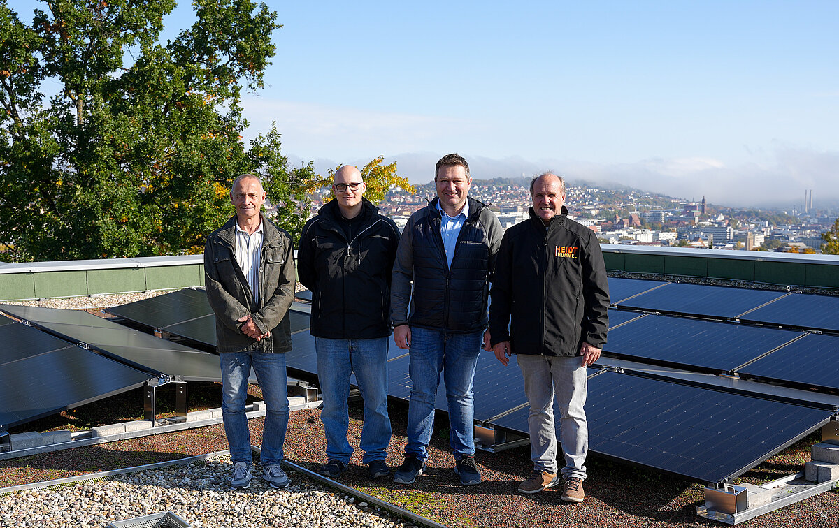 Freuen sich über die Inbetriebnahme der neuen Photovoltaikanlage auf dem Dach des Reuchlin-Gymnasiums (von links): Rainer Störzenecker, Sachgebietsleitung Technische Gebäudeausrüstung, Daniel Eberle, Geschäftsführer EBI Eberle Beratende Ingenieure GmbH, Jan Kühner, Technisches Gebäudemanagement und Tobias Hummel, Geschäftsführer Heidt & Hummel Elektrotechnik GmbH.