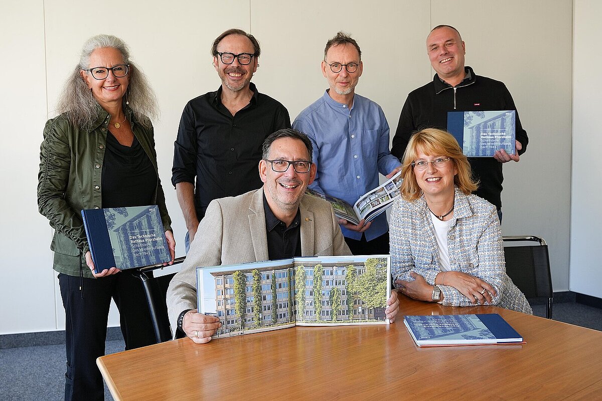 (v.l.): Autorin Dr. Chris Gerbing, Andreas Ochs von der Agentur agil visuelle Kommunikation, Bürgermeister Tobias Volle, Architekturfotograf Bernhard Friese, Kulturamtsleiterin Angelika Drescher und Videograf Jens Alemann präsentieren die Publikation zum Technischen Rathaus.