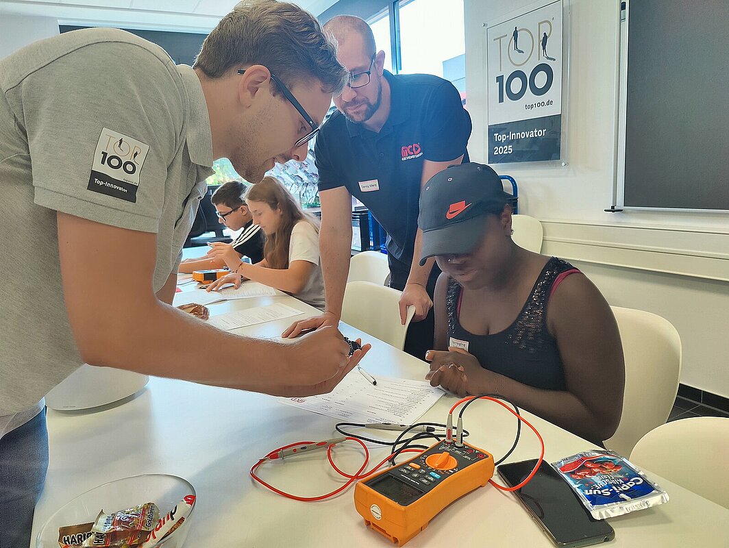 Prüfung eines kleinen Einplatinenroboters mit Hilfe von den Ausbildern Tim Retzlass (1. v. l.) und Danny Merz (4. v. l.).