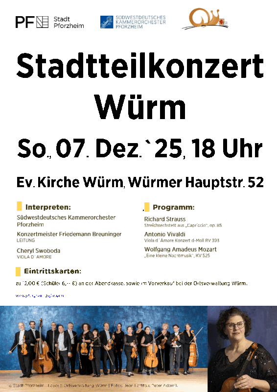 Die Ortsverwaltung freut sich, seinen Stadtteilbürger*innen in diesem Jahr wieder das Südwestdeutsche Kammerorchester Pforzheim präsentieren zu können. Das Stadtteilkonzert findet am Sonntag, 07. Dezember 2025 um 18.00 Uhr in der Ev. Kirche Würm, Würmer Hauptstr. 52 statt.