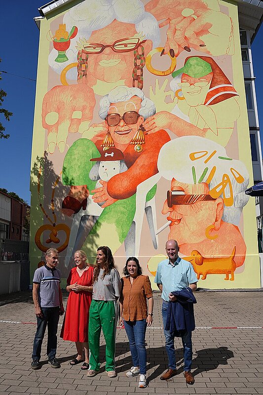 5 Personen vor einer mit gemalten Figuren verzierten Hauswand in der Kaiser-Friedrich-Straße