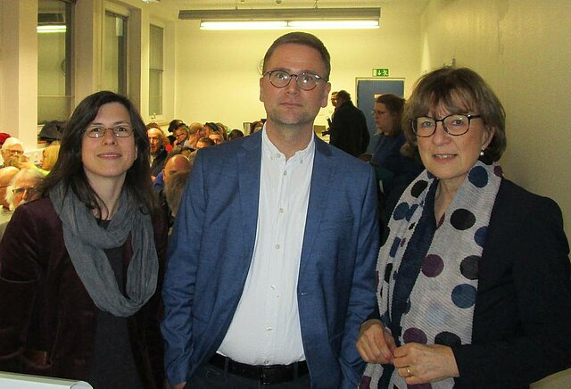 Die stellvertretende Kulturamtsleiterin Claudia Baumbusch, die in Vertretung des Oberbürgermeisters Worte des Gedenkens sprach, der Referent Dr. Christian Könne und Stadtarchivleiterin Dr. Klara Deecke (v. r. n. l., Foto: Stadtarchiv Pforzheim)