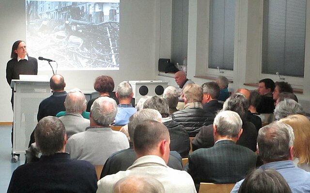 Am vergangenen Montag, 5. Februar, fand die Auftaktveranstaltung des diesjährigen Jahresprogramms „Montagabend im Stadtarchiv Pforzheim“ statt, einer Kooperationsveranstaltung mit der Löblichen Singergesellschaft von 1501 Pforzheim. Vor ca. 70 interessierten Zuhörerinnen und Zuhörern sprach Bernd Bramm, Diplom-Ökonom aus Sersheim, über historische Wetterextremereignisse. Bramm stellte in seinem kurzweiligen Vortrag u.a. die heißesten Sommer, kältesten Winter und dramatischtesten Hochwasserkatastrophen seit Beginn der Wetteraufzeichnungen in Pforzheim und dem Umland dar, wobei er die jeweiligen Folgen für den Alltag der Menschen, aber auch wirtschaftliche Schäden wie Ernteausfälle thematisierte. Der Schlussteil des Vortrags war Sturmereignissen gewidmet, nicht fehlen durfte dabei auch der Tornado vom 10. Juli 1968, der sich dieses Jahr zum 50. Mal jährt. Viele der Anwesenden hatten das Ereignis selbst erlebt und berichteten im Nachgang des Vortrags anschaulich darüber.