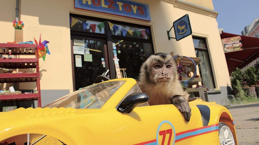 Um seine Familie zu befreien, geht er in die Lüfte – mit einem Modellflugzeug, mit einem Ballon und sogar auf dem Rücken eines Adlers! Diesen fliegenden Affen halten weder Zoowärter noch Polizei, und auch nicht die Schwerkraft auf…