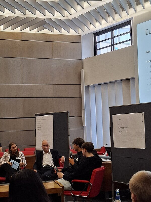 Ein Highlight des Jugendrathaus ist jeweils das direkte Gespräch mit einem der Pforzheimer Bürgermeister. Den Fragen der Schülerinnen und Schüler stellten sich bisher der Erste Bürgermeister Dirk Büscher, Baubürgermeister Tobias Volle und Sozialbürgermeister Frank Fillbrunn. In offener Atmosphäre konnten die Jugendlichen ihre Anliegen vorbringen und erfuhren aus erster Hand, wie politische Entscheidungen in Pforzheim getroffen werden.
