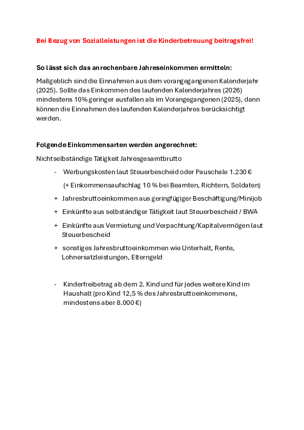 Die Kostenhöhe für Ihren Anteil an den Betreuungskosten orientiert sich an Ihrer Einkommenshöhe. Damit wir Ihr anrechenbares Einkommen genau ermitteln können benötigen wir einige Angaben.