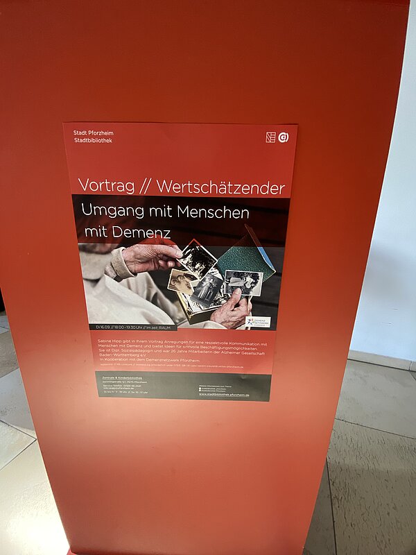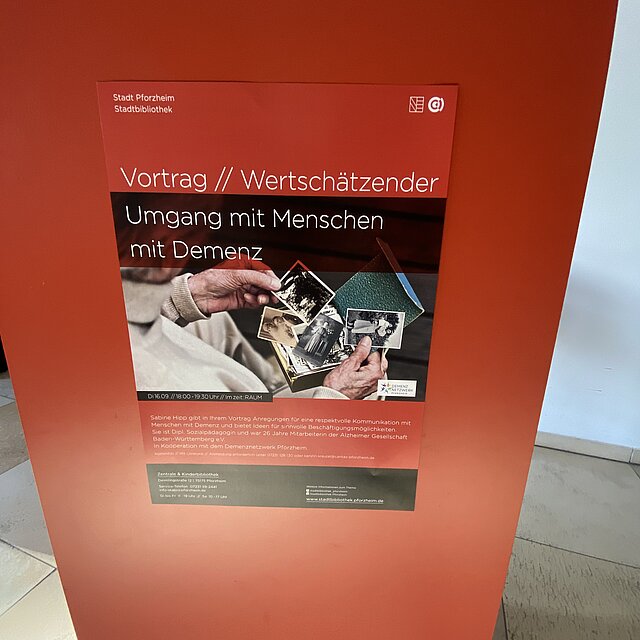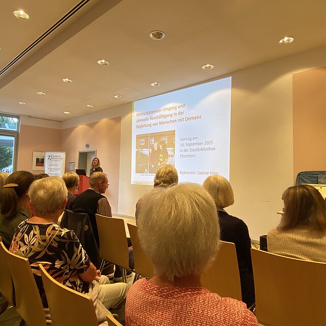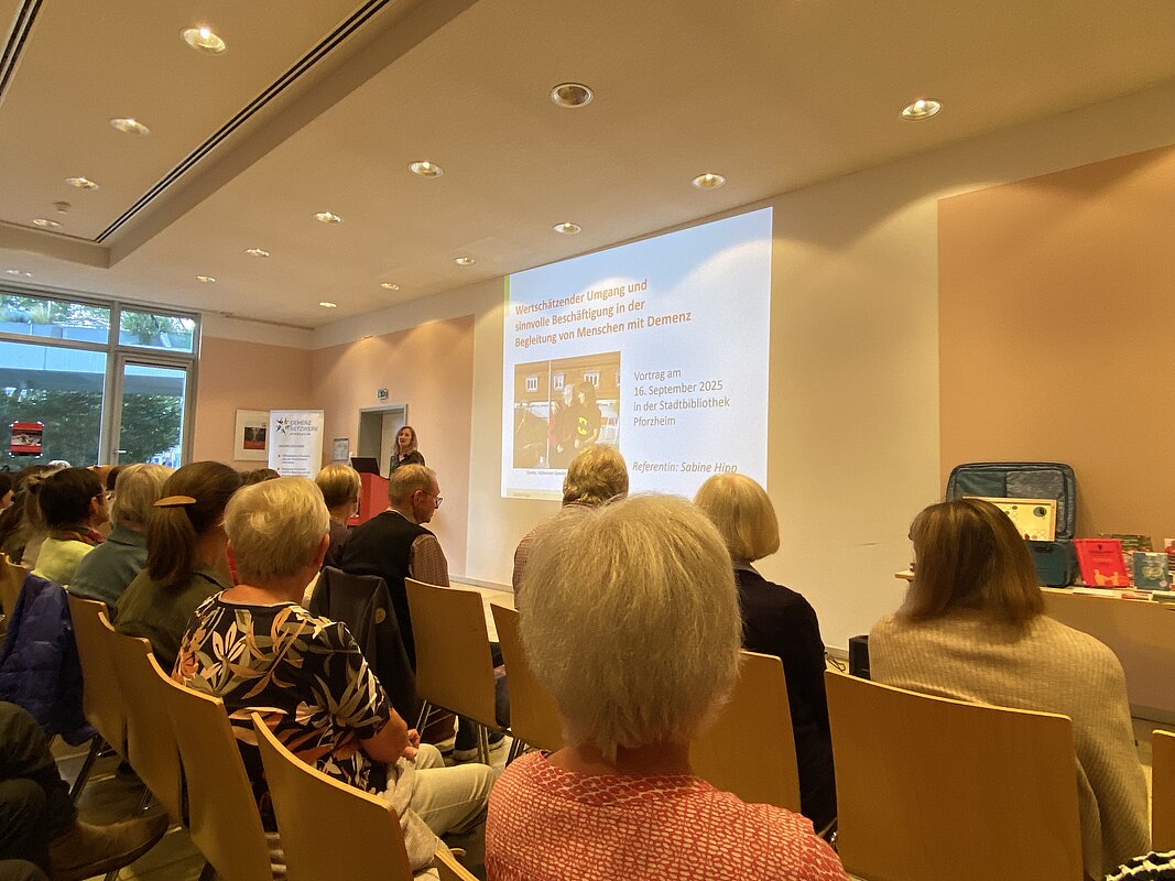 Rund 70 Interessierte kamen am 16. September 2025 in die Stadtbibliothek Pforzheim zum Vortrag „Wertschätzender Umgang und sinnvolle Beschäftigung in der Begleitung von Menschen mit Demenz“.