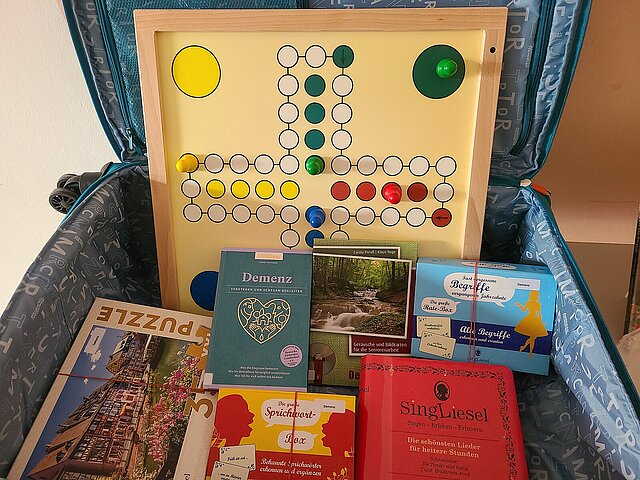 Der Medienkoffer wurde vom Demenznetzwerk Pforzheim in Zusammenarbeit mit der Stadtbibliothek Pforzheim zusammengestellt – mit dem Ziel, Angehörige und Menschen mit Demenz im Alltag zu unterstützen.