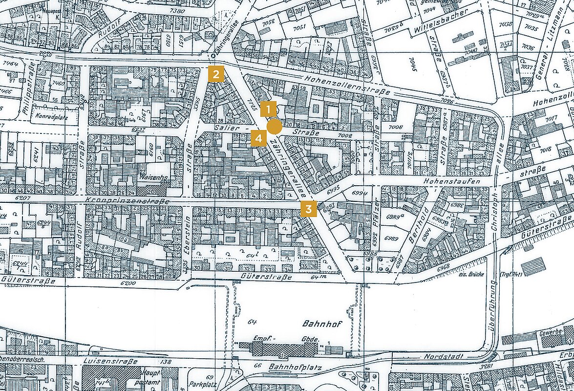 The four-storey town-house "Zähringerallee 24" with simple natural stone façade was established in 1923 for the builder Felice Brano who immigrated from Italy to Pforzheim and called himself later Felix Bran. His initials "FB" and the year of construction „1923“ appear over the gate. In Pforzheim, Brano was leading dealer of building material such as artificial stone and terrazzo.