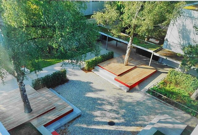 Komplette Umgestaltung des Schulhofes: Eneuerung der Belagsflächen mit Entwässerung. Moderne Spielgeräte (Kletterlandschaft, Trampoline etc.), Sitzmöbel und Holzdecks sowie Neubepflanzung mit Bäumen, Hecken und Stauden.
