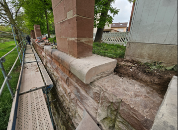 Insgesamt wurden 16 m kaputte Sandstein-Abdeckplatten ausgetauscht. Die Lagerfuge - zw. Abdeckplatte und Mauer wurde ebenfalls auf der gesamten Länge erneuert. In Teilen wurden die Sandsteinpfeiler repariert und instand gesetzt.