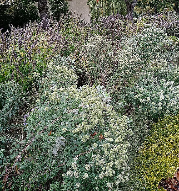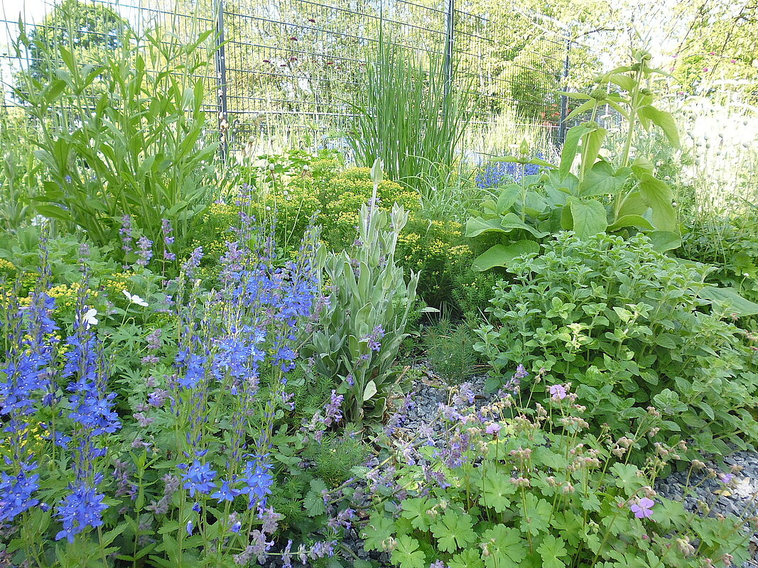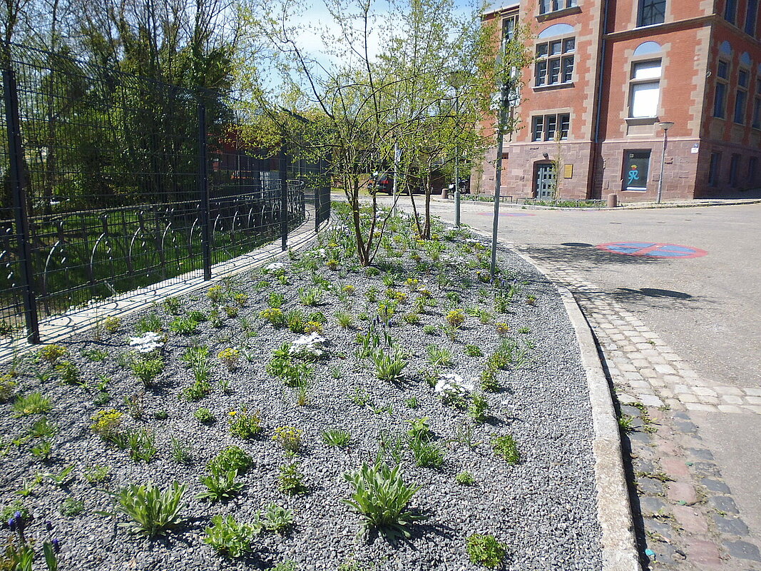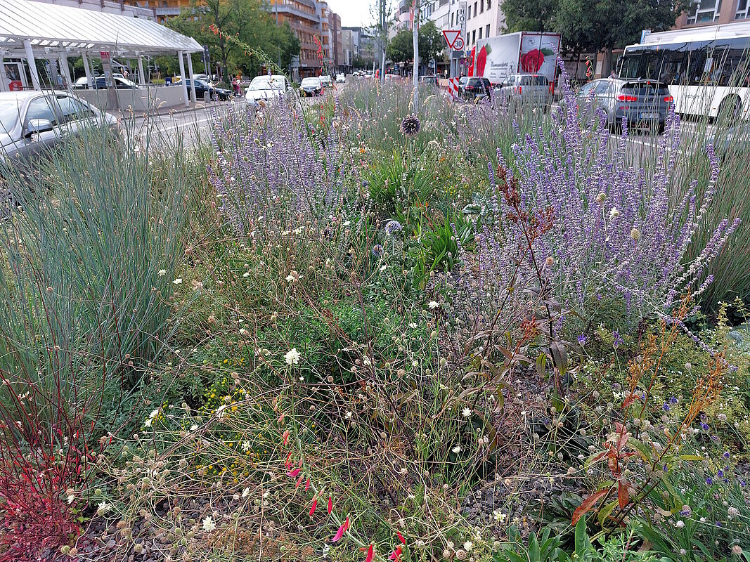 Die Bepflanzungsart darf jedoch auf keinen Fall mit den lebensfeindlichen Schotterwüsten verwechselt werden. Bei den städtischen Staudenmischpflanzungen, bei der mineralische Splittschicht verwendet wird, haben wir eine Pflanzendichte von rund zehn hochwertigen Pflanzen auf den Quadratmeter. Die Neupflanzungen bilden bereits im 2. Standjahr eine geschlossene Pflanzendecke, so dass von der aufgebrachten mineralischen Mulchschicht nur noch Fragmente zu sehen sind.