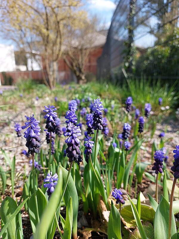 Um das Wachstum der neuen Stauden zu fördern und den Pflegeaufwand zu minimieren, wurde eine mineralische Mulchschicht auf die Fläche aufgetragen. Diese schützt den Boden vor Erosion, speichert Feuchtigkeit, verhindert schnelles Austrocken und sorgt in dem begrenzt zur Verfügung stehenden Pflanzenraum für optimale Anwachsbedingungen. In Blau-, Weiß- und Gelbtönen wird schon bald die Mulchschicht mit einer farbenfrohe Pflanzendecke überzogen sein.