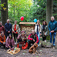 Auf dem Bild ist eine große Gruppe von Menschen vor einem Schild mit der Aufschrift Zauberwald zu sehen.