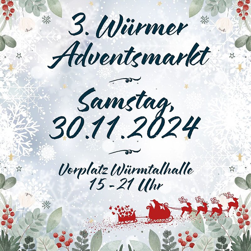 Am Samstag, 30. November, findet von 15 bis 21 Uhr bereits zum 3. Mal der Würmer Adventsmarkt auf dem Vorplatz der Würmtalhalle statt. Die örtlichen Vereine, Organisationen und Kirchen haben wieder einiges vorbereitet und freuen sich auf zahlreiche Besucherinnen und Besucher. „Alle Bürgerinnen und Bürger sind dazu herzlich eingeladen, gemeinsam mit uns in den Advent zu starten“, so Ortsvorsteher Florian Bähr.