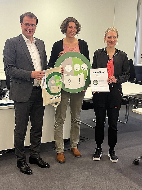 V.l.: Staatssekretär Volker Schebesta, stellvertr. Amtsleiterin Marion Hekmann, Leiterin Öffentlichkeitsarbeit Ruth Jaeckle bei der Verleihung des Alpha-Siegels