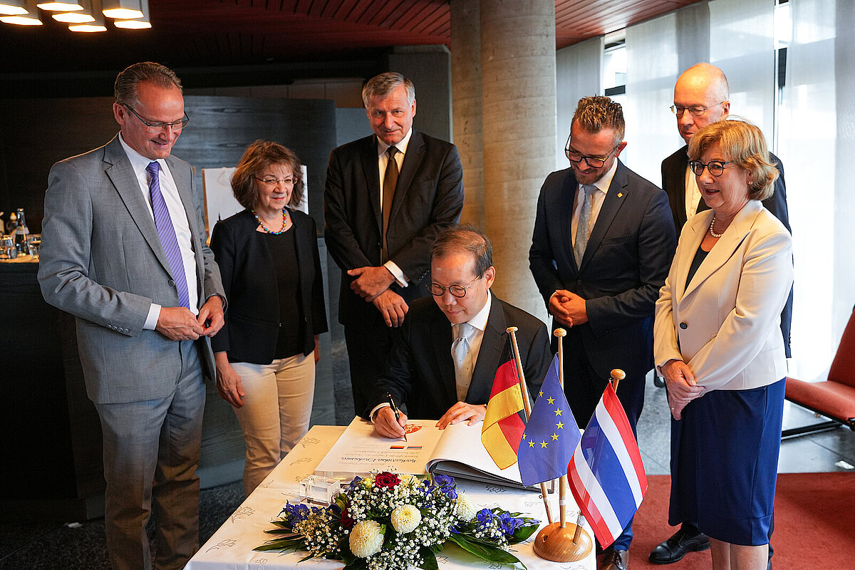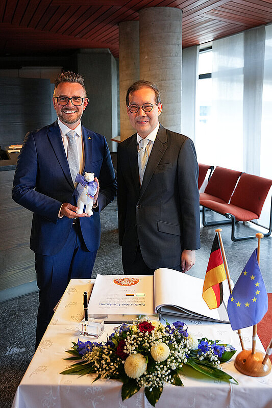 Am Mittwoch, 30. August, begrüßte Oberbürgermeister Peter Boch den Botschafter des Königreichs Thailand in der Bundesrepublik Deutschland, S. E. Nadhavathna Krishnamra, im Pforzheimer Rathaus. Bei dieser Gelegenheit trug er sich auch in das Goldene Buch der Stadt Pforzheim ein. Botschafter Krishnamra kam auf Einladung des Bundestagsabgeordneten Gunther Krichbaum in Begleitung der Generalkonsulin Prapenpim Prachnopachanuk nach Pforzheim. Die Delegation besuchte neben dem Rathaus den Schmuckhersteller Breuning, der seit 1992 eine Produktionsstätte in Thailand betreibt, die Ausstellung „Das kalte Herz“ im Schloss Neuenbürg sowie das Gasometer in Pforzheim.