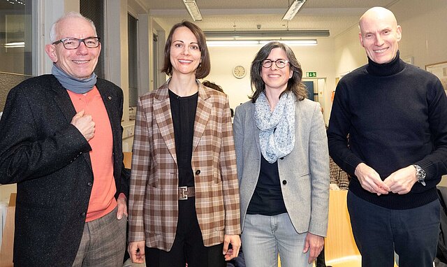 Kai Adam (Löbliche Singergesellschaft von 1501 Pforzheim), Referentin Tabea Schmid (Hochschule Pforzheim), Klara Deecke (Stadtarchiv) sowie Professor Thomas Hensel (Hochschule Pforzheim) (von links)