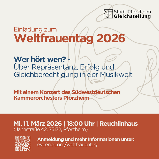 Anlässlich des Weltfrauentags lädt die Gleichstellungsstelle der Stadt Pforzheim am Mittwoch, 11. März, 17:30 Uhr, zu einem Empfang unter dem Motto „Wer hört wen? – Über Repräsentanz, Erfolg und Gleichberechtigung in der Musikwelt“ in das Reuchlinhaus (Jahnstraße 42, 75172 Pforzheim) ein. Im Mittelpunkt stehen die Fragen: Wer bestimmt eigentlich, was wir hören? Wer steht am Dirigierpult, wer erhält die Fördergelder und wessen Musik schafft es in die großen Konzertsäle? Warum sind dort meistens Männer zu sehen und viel weniger Frauen? „Es werden Fragen in den Vordergrund gerückt, die es ermöglichen den eigenen Horizont zu erweitern und den Blick für die Leistungen von Frauen in der Musik schärfen. Ich bin gespannt auf einen Abend voller neuer Impulse und freue mich besonders auf die Darbietungen des Südwestdeutschen Kammerorchesters, das diesen Werken die Bühne gibt, die sie verdienen“, so Bürgermeister Dirk Büscher.