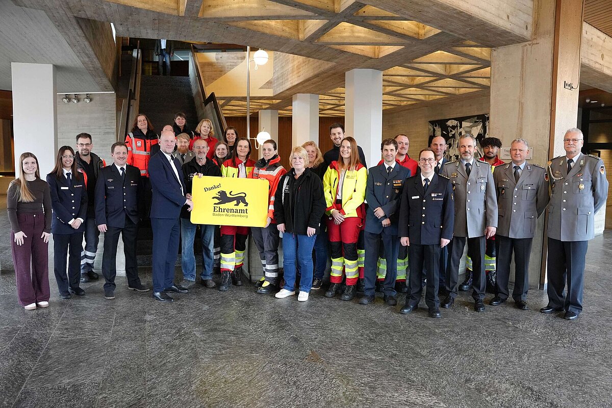 Erster Bürgermeister Dirk Büscher (links neben der Ehrenamtskarte) überreicht den ehrenamtlichen Blaulichtorganisationen die Ehrenamtskarte Baden-Württemberg. Begleitet wird er vom Leiter des Katastrophenschutzes, Sebastian Fischer (vierter von rechts in der ersten Reihe), und von Anne Schneider, Koordinatorin der Ehrenamtskarte (links).