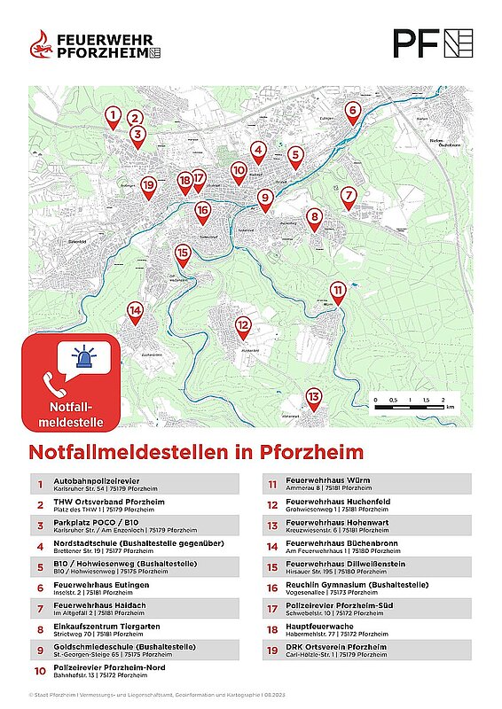 Nur 13 Minuten im Jahr gibt es durchschnittlich in Deutschland keinen Strom. Dies ist im europäischen Vergleich ein Spitzenwert und ein Beweis für die hohe Versorgungssicherheit der Stromnetzbetreiber. Dennoch sind Stromausfälle nicht ausgeschlossen und können unterschiedlichste Ursachen haben, wie z. B. Bauarbeiten, Unwetter oder auch Stromschwankungen im europäischen Stromnetz. Wenn Festnetztelefone und der Mobilfunk bei Stromausfällen längere Zeit nicht mehr funktionieren, können Bürgerinnen und Bürger über die Notrufe 110 und 112 keine schnelle Hilfe mehr herbeirufen. Daher richten Einsatzkräfte Notfallmeldestellen an verschiedenen Standorten ein. „Wo sich die nächstgelegene Notfallmeldestelle in Pforzheim befindet, hat das Fachamt Feuerwehr, Bevölkerungs- und Katastrophenschutz in einem Flyer dargestellt“, erklärt Feuerwehrkommandant und Leiter des Bevölkerungsschutzes, Sebastian Fischer. Dieser Flyer wird allen Haushalten zusammen mit dem Abfallkalender 2024 zugestellt und in den nächsten Tagen im Briefkasten liegen. „Wir empfehlen, den Flyer gut aufzubewahren, damit die Bürgerinnen und Bürger beim längeren Ausfall der Notrufe gut informiert sind, wo sie bei dringenden Notfällen Hilfe anfordern können“, rät Erster Bürgermeister Dirk Büscher.