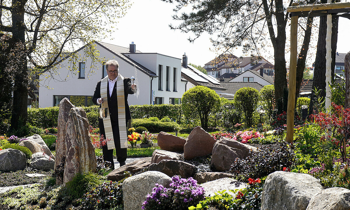 Die Ortsverwaltung Hohenwart bietet ab jetzt auch naturnahe Bestattungen an. Gemeinsam mit dem Grünflächen- und Tiefbauamt konnte ein sogenanntes Baumgrabfeld auf dem Friedhof des Höhenstadtteils realisiert werden. Nun gibt es rund um das Gefallenen-Mahnmal mehrere Baumgräber, die neben verschiedenen Baumarten wie Toringo Zier-Apfel, Scharlach-Kirsche und Zier-Kirsche Plena mit naturnahen Pflanzen und Gräsern bepflanzt sind. Das Projekt wurde gemeinsam mit der Friedhofsgärtnerei Hilligardt aus Pforzheim und dem Gärtnereibetrieb Hartmann aus Wurmberg realisiert. Das neue Bestattungsangebot bietet ausschließlich Urnengräber an und wird anschließend von Friedhofsgärtnern gepflegt. Anlässlich der Fertigstellung hat Pfarrer Wolfgang Kribl das Grabfeld heute Vormittag gesegnet. „Wir freuen uns sehr, unseren Bürgerinnen und Bürgern nun eine solche Möglichkeit der letzten Ruhestätte bieten zu können“, so Hohenwarts Ortsvorsteher Siegbert Morlock, der die Idee mit initiiert hatte.
