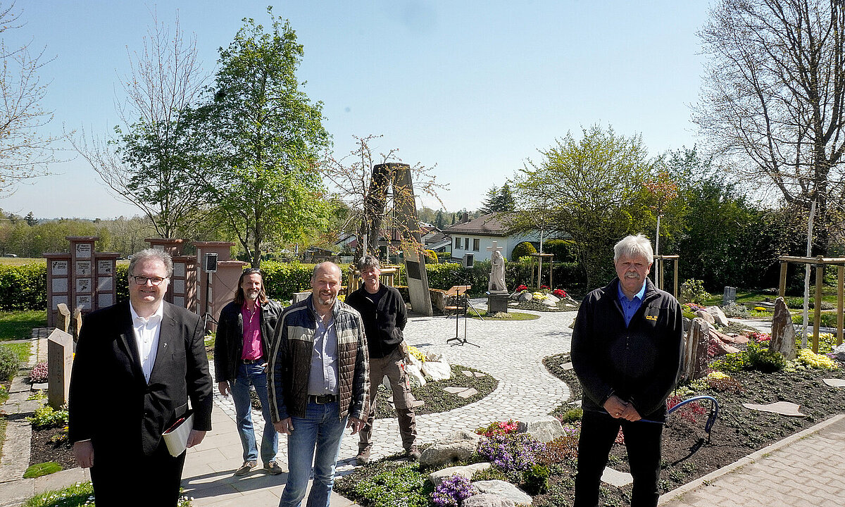 v.l.: Pfarrer Wolfgang Kribl, Markus Pudschun (Friedhofsverwaltung), Jens Hartmann (Gärtnerei und Landschaftsbau Hartmann, Wurmberg), Christof Hilligardt (Friedhofsgärtnerei Hilligardt) und Ortsvorsteher Siegbert Morlock bei der Segnung anlässlich der Einweihung des neuen Baumgrabfeldes (@Stadt Pforzheim; Stefan Baust)