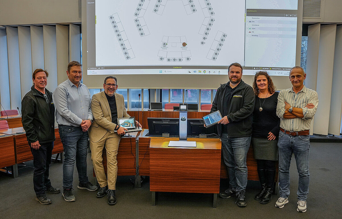 Gruppenbild der Verantwortlichen der neuen Medientechnik im Großen Ratsaal