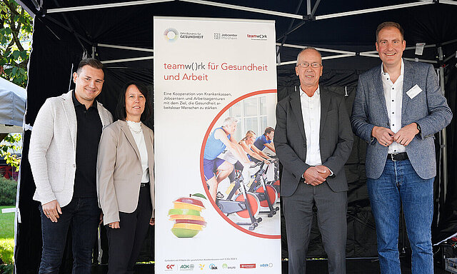 Mit dem Programm „teamw()rk für Gesundheit und Arbeit“ erweitern das Jobcenter und die gesetzlichen Krankenkassen ihre Unterstützung in der Beratung und Betreuung arbeitsloser Menschen. Das Programm mit seinen vielfältigen Angeboten setzt auf Vorbeugung, um Erkrankungen gar nicht erst entstehen zu lassen oder vorliegende gesundheitliche Einschränkungen soweit wie möglich abzubauen und Teilhabe am Erwerbsleben zu ermöglichen.