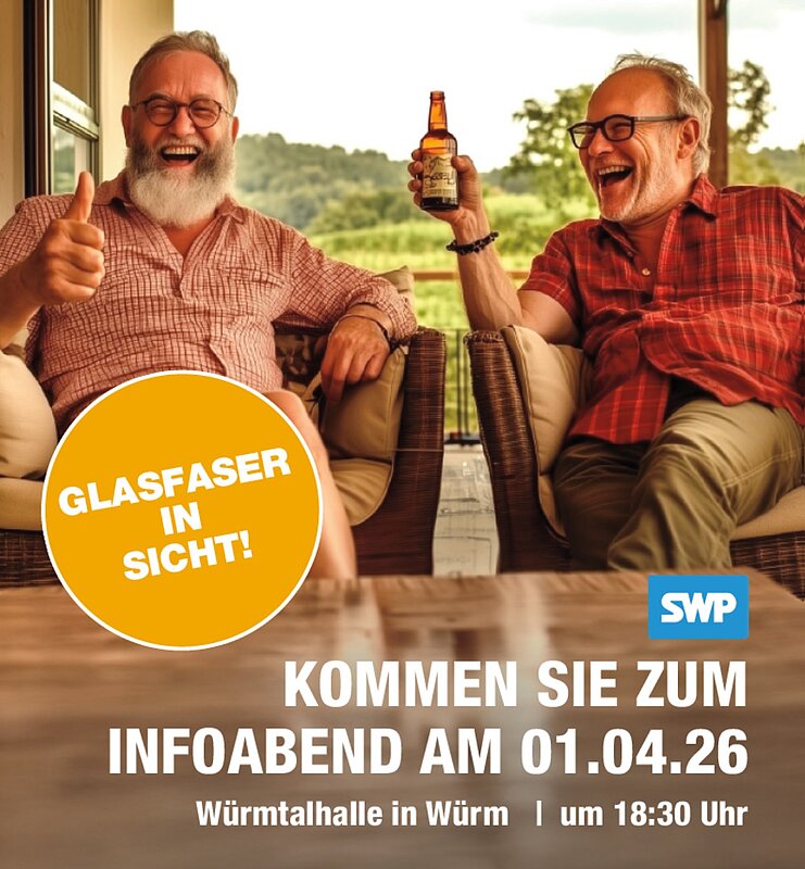Um die Bürgerinnen und Bürger umfassend über das Vorhaben zu informieren, laden die SWP am Mittwoch, 1. April 2026, um 18:30 Uhr zu einer Informationsveranstaltung in die Würmtalhalle ein. Ergänzend dazu wird das Glasfaser-Info-Wohnmobil regelmäßig vor Ort sein und eine persönliche Beratung durch geschulte Mitarbeiterinnen und Mitarbeiter anbieten.