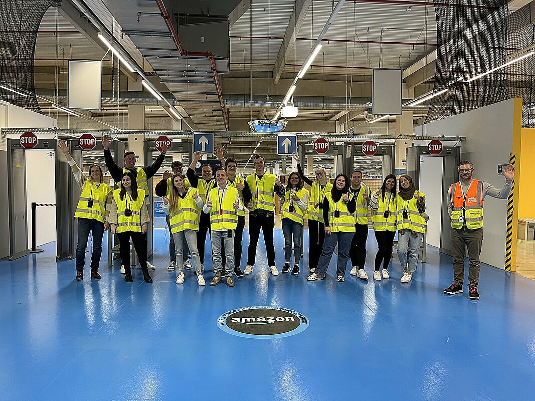 Die Studierenden waren sichtlich beeindruckt von der Logistikkette bei Amazon. Vom Wareneingang über die Kommissionierung und Packstation bis hin zum Warenausgang lernten sie, wie viele Stationen ein Produkt durchlaufen muss, um am Ende pünktlich bei den Kundinnen und Kunden anzukommen. Besonders das Hochregallager und das Zusammenspiel zwischen hochmoderner Technologie und engagierten Mitarbeitenden imponierte den Studierenden sehr. Außerdem konnten die Studierenden im direkten Austausch ihre Fragen klären.