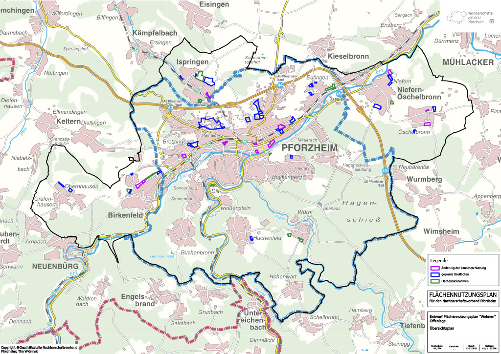 Die Stadt Pforzheim und die Gemeinden Birkenfeld, Ispringen und Niefern-Öschelbronn planen gemeinsam ihre städtebauliche Entwicklung für insgesamt rund 150.000 Einwohnerinnen und Einwohner. Organisiert wird diese Planung im Nachbarschaftsverband Pforzheim (NBV). Dafür schreiben Stadt und Gemeinden den derzeit wirksamen Flächennutzungsplan von 2005 fort.