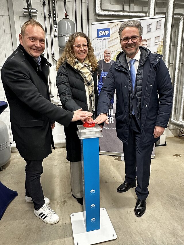 SWP-Geschäftsführer Dr. Aik Wirsbinna, Ortsvorsteherin Melanie Kirchgessner und OB Peter Boch (von links) haben die Energiezentrale feierlich eingeweiht.