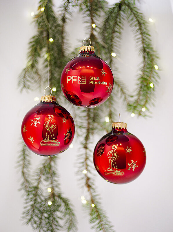 Bereits zum dritten Mal gibt es auch in diesem Jahr eine neue Pforzheimer Weihnachtskugel in der Tourist-Information Pforzheim zu kaufen. Wie schon im Jahr 2021 handelt es sich bei der aktuellen Weihnachtskugel um eine im Bordeauxrot gehaltene Glaskugel. Geziert wird sie, ganz im Sinne der „Goldstadt“, von einem goldenen Logo der Stadt Pforzheim sowie einer charismatischen Darstellung des „Pforzheimer Seckel“. Als historischer Protagonist bringt der Seckel ein kleines Stück Pforzheimer Geschichte an den Weihnachtsbaum.