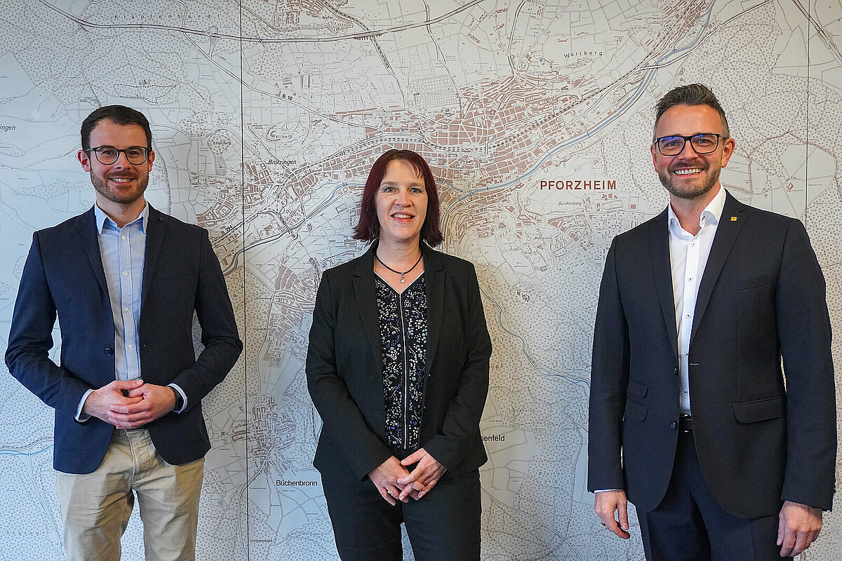 Digitalisierungsbeauftragter Kevin Lindauer und Oberbürgermeister Peter Boch mit der neuen Digitalisierungsbeirätin Stella Grießmayer (Leiterin der Stabstelle Digitalisierung des Städtetags Baden-Württemberg)