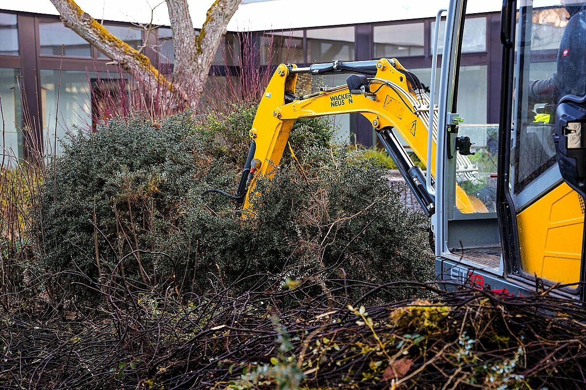 Auch der angrenzende Hort erhält neue Pflanzbeete im Eingangsbereich. Die bestehenden Gehölze im Eingangsbereich des Horts wurden ebenfalls mit Hilfe eines Minibaggers vollständig gerodet und der durchwurzelte Boden ausgebaggert. Sobald die Witterungsbedingungen geeignet sind, entstehen dort insektenfreundliche- und mehrjährige Staudenbeete.