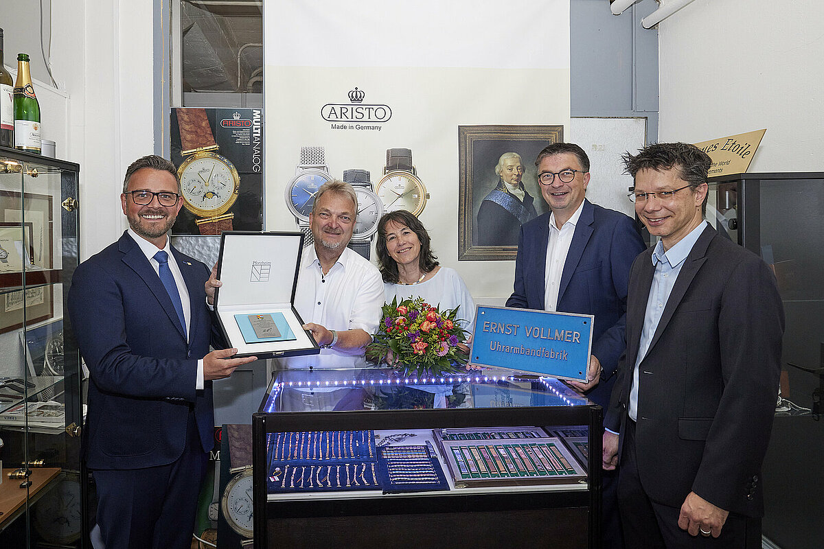 Die Marke „VOLLMER“ feiert Geburtstag: Bereits seit 100 Jahren fertigt das Unternehmen Metall-Uhrarmbänder und Bandgehäuse. Oberbürgermeister Peter Boch hat gemeinsam mit WSP-Direktor Oliver Reitz und Markus Epple, Geschäftsbereichsleiter der WSP-Wirtschaftsförderung, die Glückwünsche der Stadt überbracht und dem Unternehmen für sein langjähriges Engagement und die Treue zum Kompetenzstandort Pforzheim gedankt.