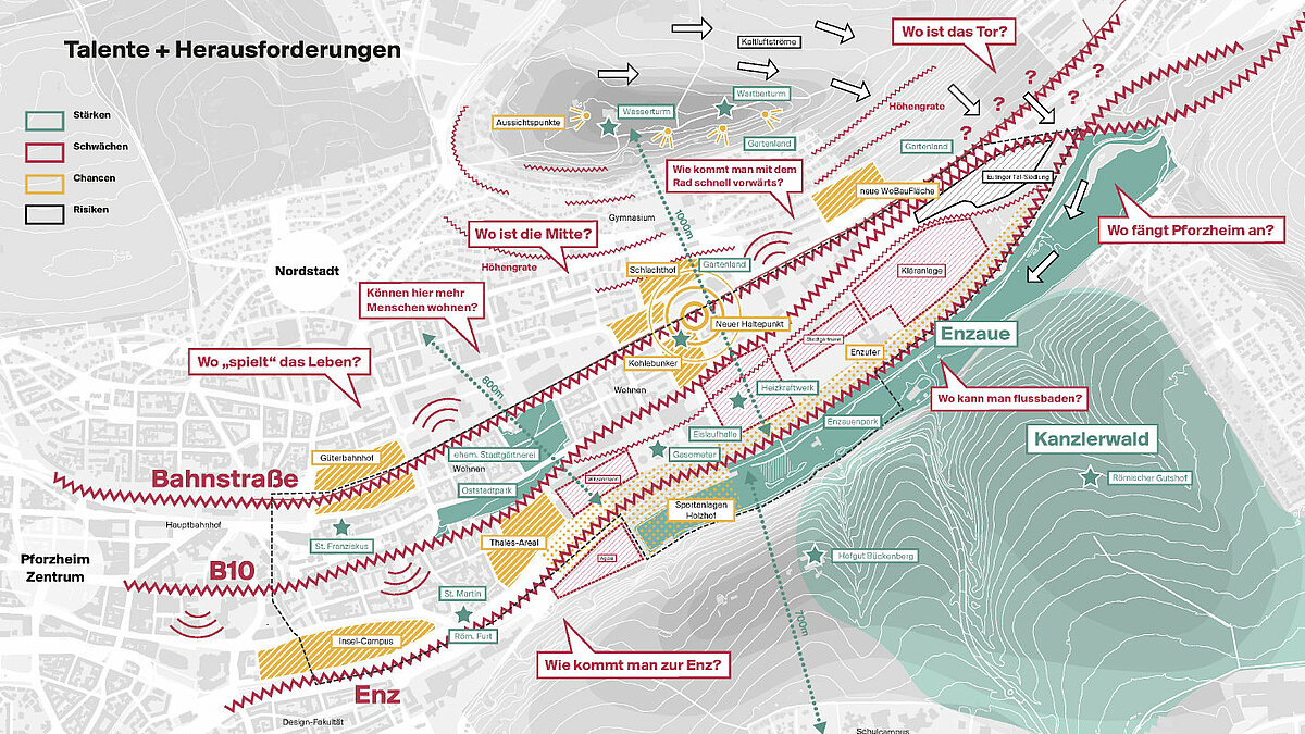 Die Pforzheimer Oststadt ist ein Stadtteil mit einem Nebeneinander von wichtigen Gewerbeunternehmen und kleinteiligen Wohnquartieren, zentralen Industrieanlagen und touristischen Highlights, pulsierenden Verkehrsadern und verwunschenen Parks. Welche Entwicklung sollen sie nehmen? Welche Perspektive hat der Stadtteil? Wo fängt die Zukunft des Stadtteils an? Um Antworten auf diese Fragen zu finden, hat die Stadt Pforzheim den Prozess für eine Rahmenplanung für die Oststadt ausgelobt.