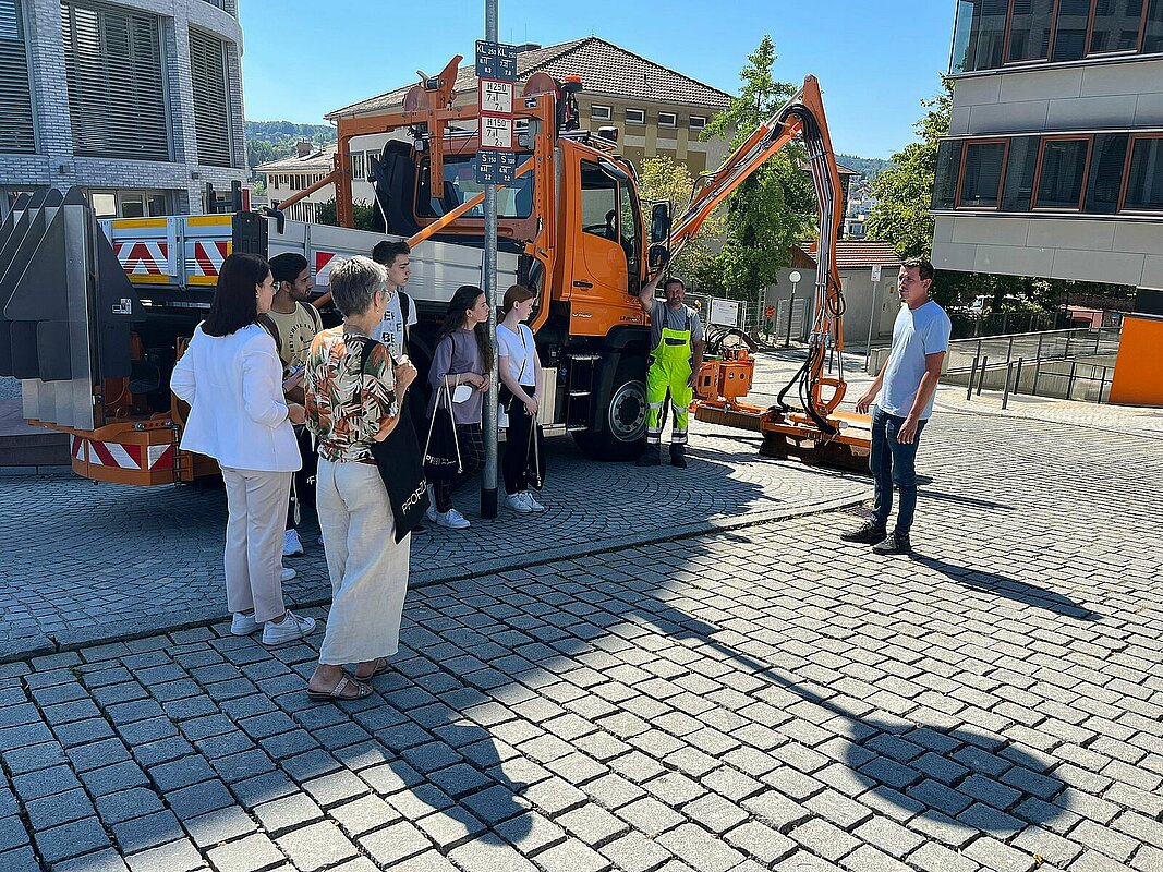 Florian Schmauder (re), Ausbilder Gärtner/Garten- und Landschaftsbau bei den Technischen Diensten der Stadt Pforzheim erklärt die Funktionen eines Unimogs. © WSP