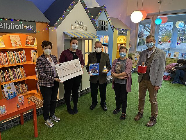 Eine Spende der C.+G. Hausch-Stiftung ermöglicht die Anschaffung von Tonie- und SAMI-Figuren. Darüber freuen sich Stiftungsvorstand Sieglinde Haug, Bibliotheksleiterin Ines Neumann, Stiftungsrat Dieter Brüstle, Leiterin der Kinderbibliothek Petra Hähl, Stiftungsrat Johannes Bender (von links). © Stadt Pforzheim/Ruth Prenting