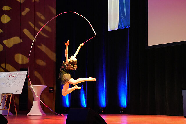 Der zweite Teil der Veranstaltung wurde mit einer Showeinlage von der 23-jährigen Maxima Bachmeyer in der Disziplin Rhythmische Sportgymnastik eingeleitet. Sie zählt zu den erfolgreichsten deutschen Turnerinnen der Rhythmischen Sportgymnastik, die sich national und international einen Namen gemacht hat. Landrat Bastian Rosenau und 1. Vorsitzender des Sportkreises Pforzheim Enzkreis e. V. Henry Wiedemann ehrten Sportlerinnen und Sportler aus dem Enzkreis für besondere Leistungen. Moderator Jörg Augenstein führte gewohnt unterhaltsam durch das Programm.