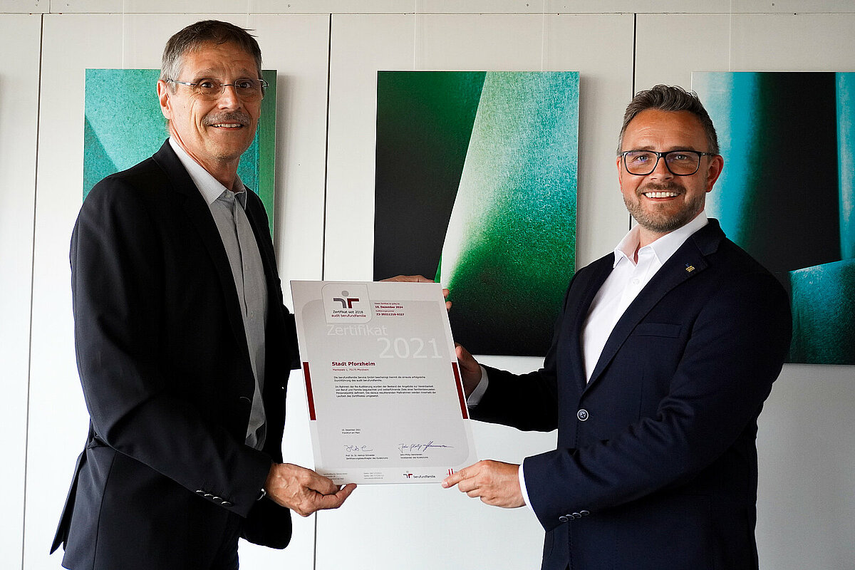 Die Stadt Pforzheim hat das Verfahren zum audit berufundfamilie zum zweiten Mal erfolgreich durchlaufen. In einer virtuellen Zertifikatsfeier unter dem Jahresmotto „miteinander vereinbaren – gesund, fair, zusammen“ wurde die Stadt Pforzheim zusammen mit weiteren 342 Arbeitgeberinnen und Arbeitgebern von der berufundfamilie Service GmbH für ihre familien- und lebensphasenbewusste Personalpolitik geehrt. Zahlreiche Gratulantinnen und Gratulanten wie Bundesfamilienministerin Lisa Paus MdB, oder Oliver Schmitz, Geschäftsführer der berufundfamilie Service GmbH fanden sich hierzu ein.